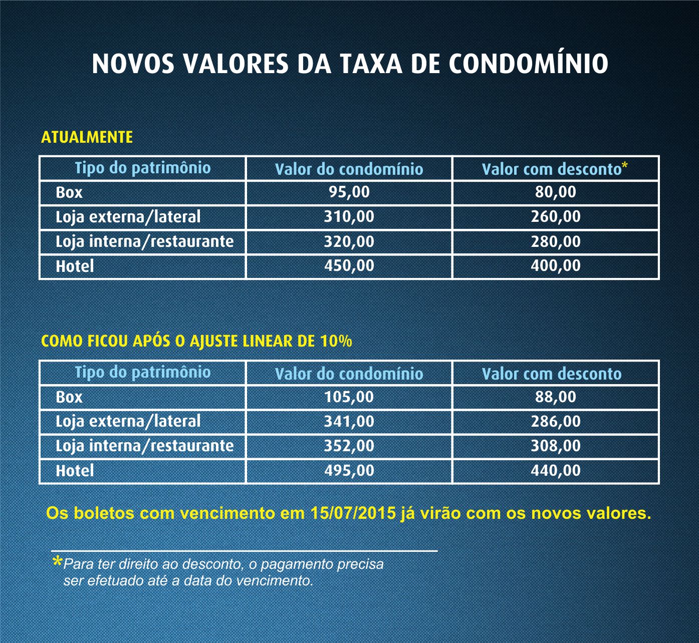 Ao analisar e discutir a proposta de um ajuste de 10% em cima do valor atual, os condôminos em sua maioria votaram favoravelmente. Com 1.120 votos a favor e apenas 170 contrários, eles compreenderam a necessidade da aplicação do ajuste.