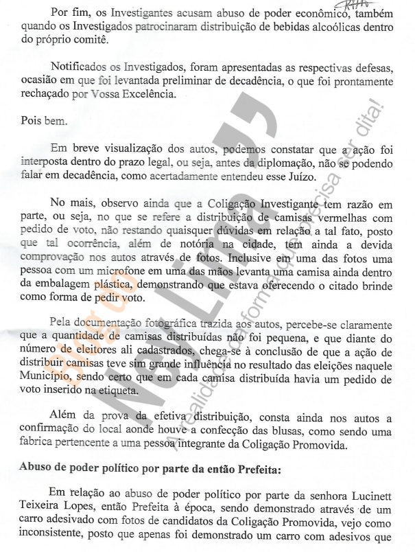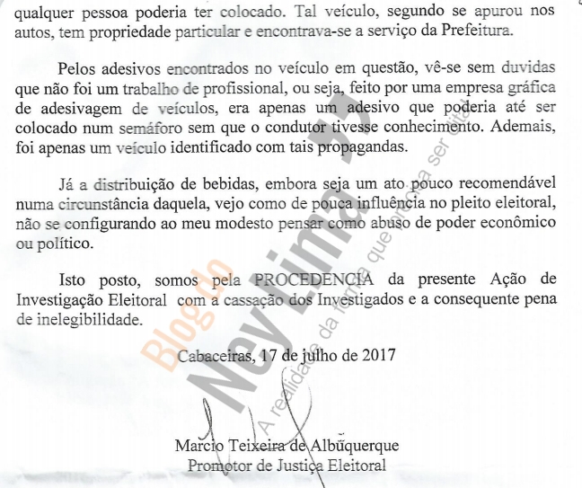 “Isto posto, somos pela procedência da presente Ação de Investigação Eleitoral com a cassação dos Investigados e a consequente pena de inelegibilidade”, afirma.