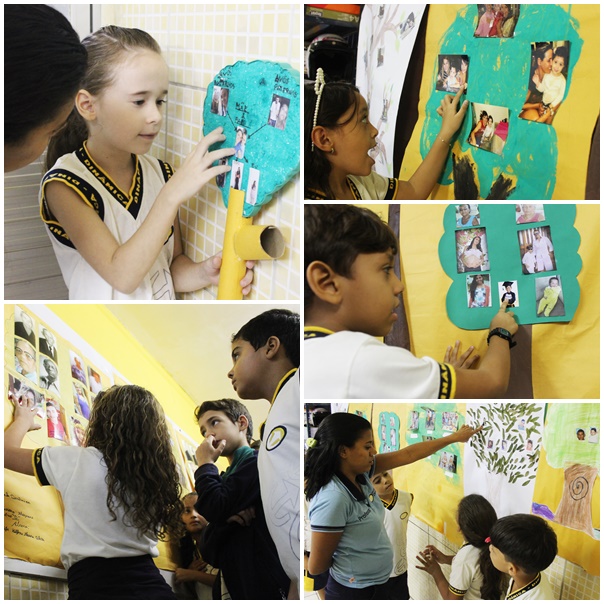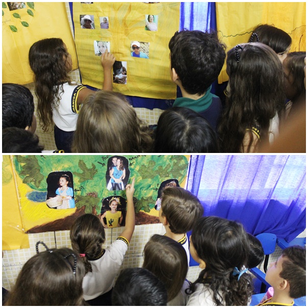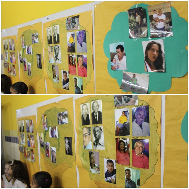 A educadora trabalhou com as crianças um modelo de árvore genealógica desenhada em tamanho grande. Nas árvores foram coladas fotografias de membros da família, como por exemplo, papai; mamãe; vovó paterna; vovô paterno; vovó materna; vovô materno e etc.